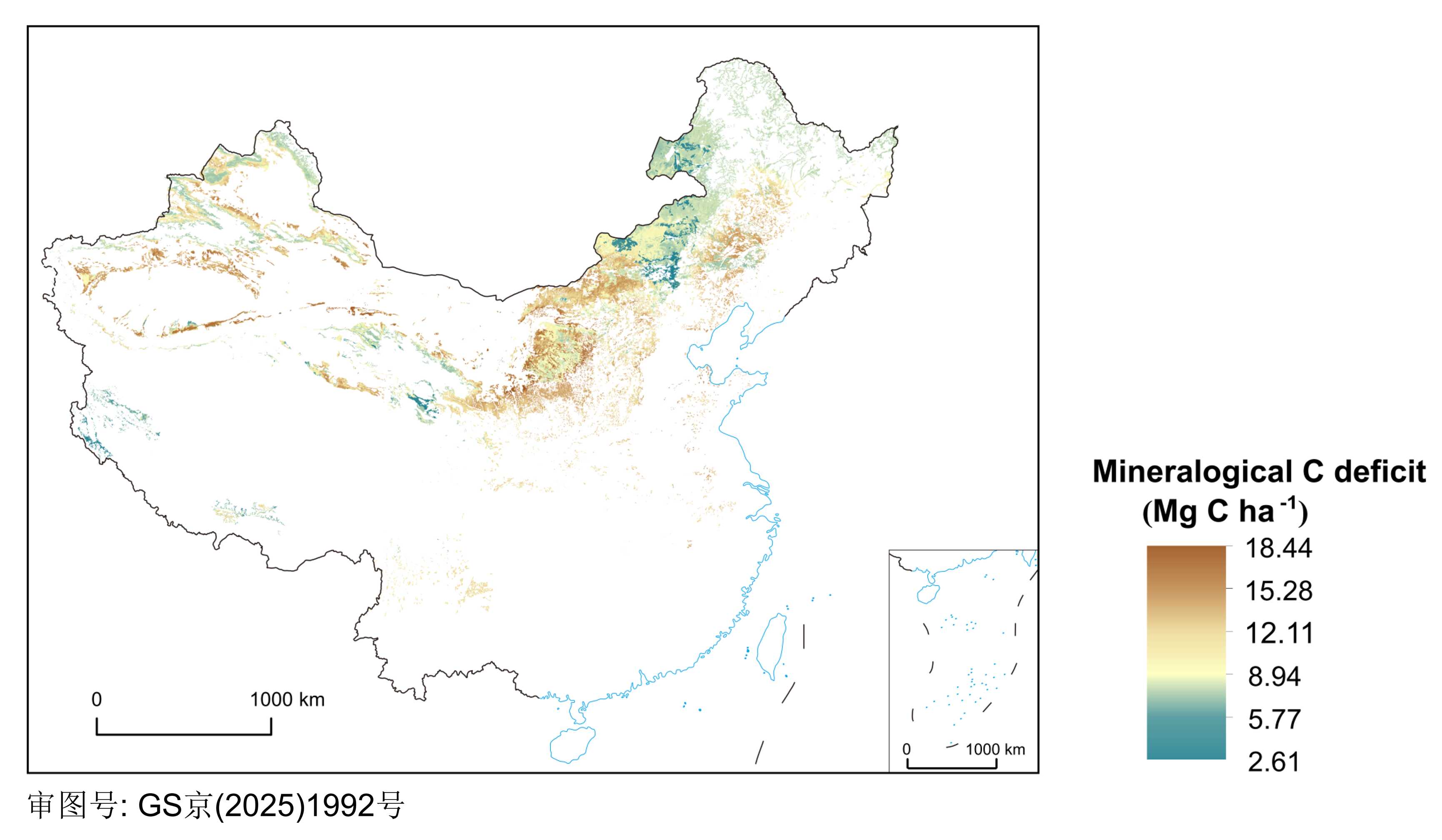 碳亏缺量反映了当前土壤MAOC含量与其理论碳饱和容量间的差距,数值越大,潜在固碳空间越大。生物地球化学循环研究平台使用稳定同位素比率质谱仪准确测定了2000公里中国温带草地样带样品,结合培养实验和机器学习建模,系统评估了矿物结合态碳(MAOC)亏缺量的空间分布及新增MAOC的形成效率。结果表明,中国温带草地碳亏缺高值区域主要分布在退化区和干旱区,其表层0—15 cm土壤固碳潜力为0.78 ± 0.08 Pg C;人类活动通过减少土壤细颗粒含量加剧土壤碳亏缺。然而,在碳亏缺较高的区域,由于有机碳、养分和微生物活性不足,新增MAOC的形成效率较低,导致潜在固碳空间难以有效转化为稳定碳库。