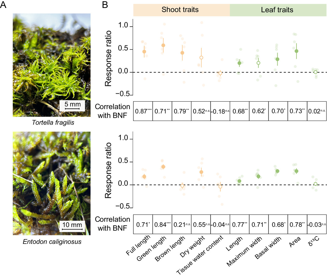 气候变暖会导致多年冻土中长期封存的大量有机质被微生物分解,以CO2和CH4等形式释放至大气,进而形成冻土碳循环与气候变暖之间的正反馈关系。同时,温度升高也会促进植被生长,部分抵消冻土碳释放,从而减缓冻土碳–气候反馈。氮素作为植被生长的重要限制因素,在调节冻土生态系统碳循环中起着关键作用。特别是,生态系统氮供给能力能否满足植被氮需求在很大程度上决定着植被生长能否持续减缓冻土碳–气候反馈效应。然而,以往研究主要关注土壤氮转化过程对生态系统氮供应的贡献,学术界尚不清楚苔藓固氮在满足植被氮需求中的作用。