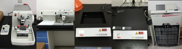 功能简介:包括Leica RM 2255全自动轮转切片机、EGEG 1150石蜡包埋机、Leica HI1210摊片机、Leica HI1220烤片机和Leica ASP 200 全自动脱水机。可以完成石蜡包埋剂的样品制备和半自动切片。